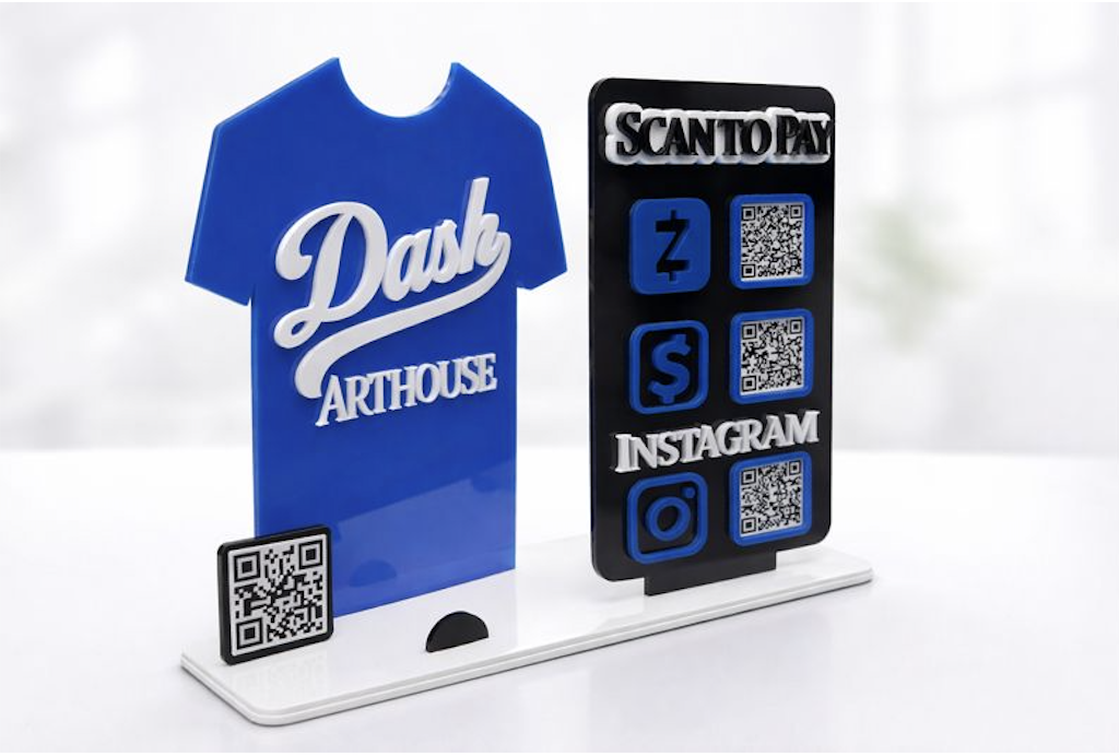 Precision laser cutting and engraving, vinyl applications, DTF apparel printing, and sublimation—crafted for custom signage, branded apparel, and personalized pieces for homes and businesses.